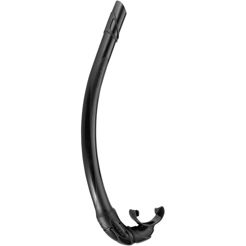 The tube on this snorkel is made from flexible polymers that allow bending and folding (into a belt or pocket). The narrow tube diameter and small profile result in a light and hydrodynamic design suitable for freediving and spearfishing.